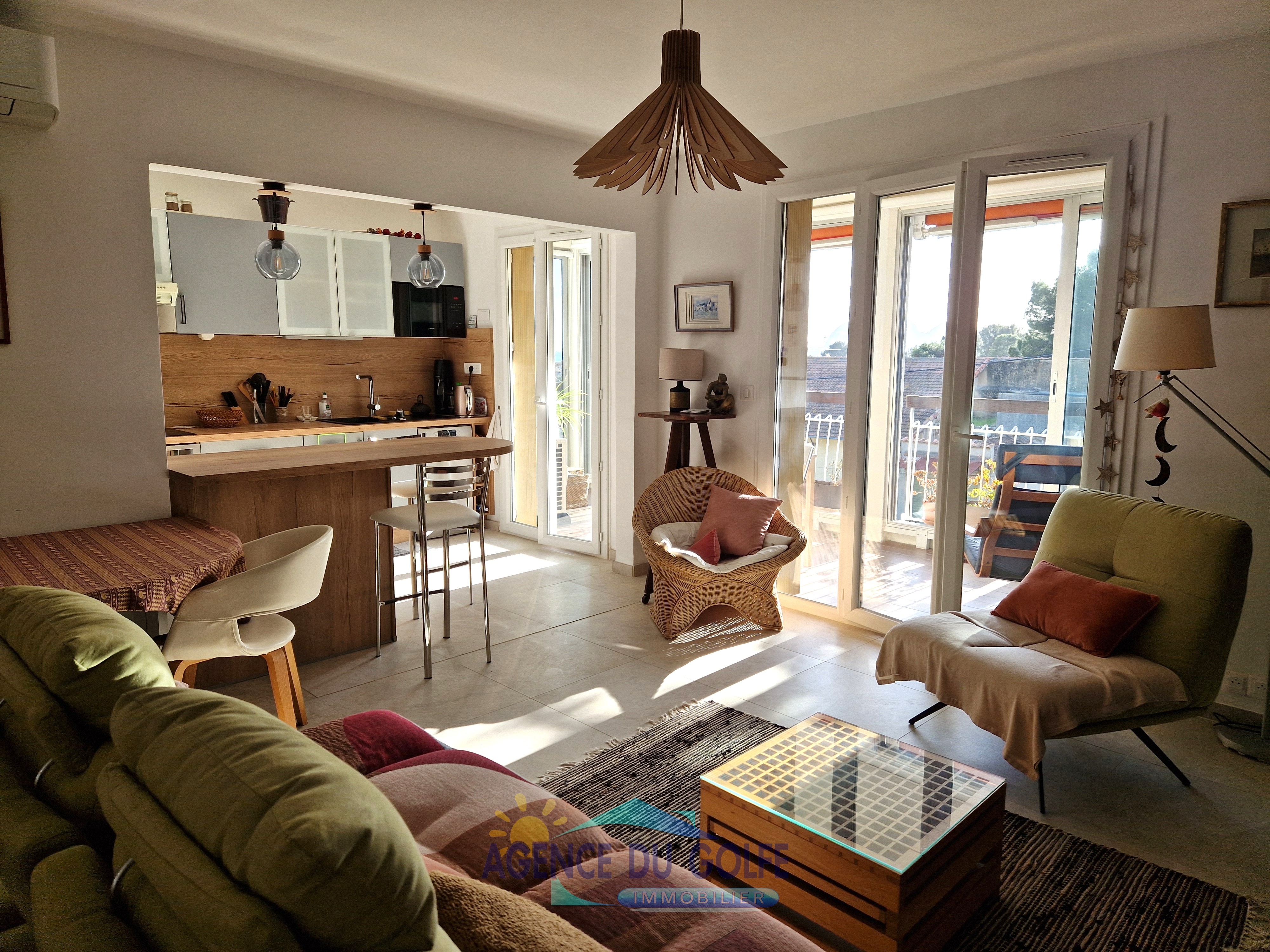 Baigné de lumière grâce à son exposition Sud/Ouest, cet appartement offre un cadre de vie confortable et soigné. Le salon-séjour de plus de 22 m² s'ouvre sur la magnifique terrasse fermée, véritable pièce supplémentaire, idéale pour un espace détente ou un coin repas avec vue dégagée : vous apercevrez la mer en fond ainsi que le merveilleux site des calanques à l'horizon. La cuisine ouverte de plus de 8 m², aménagée et équipée , complète harmonieusement l'espace de vie.