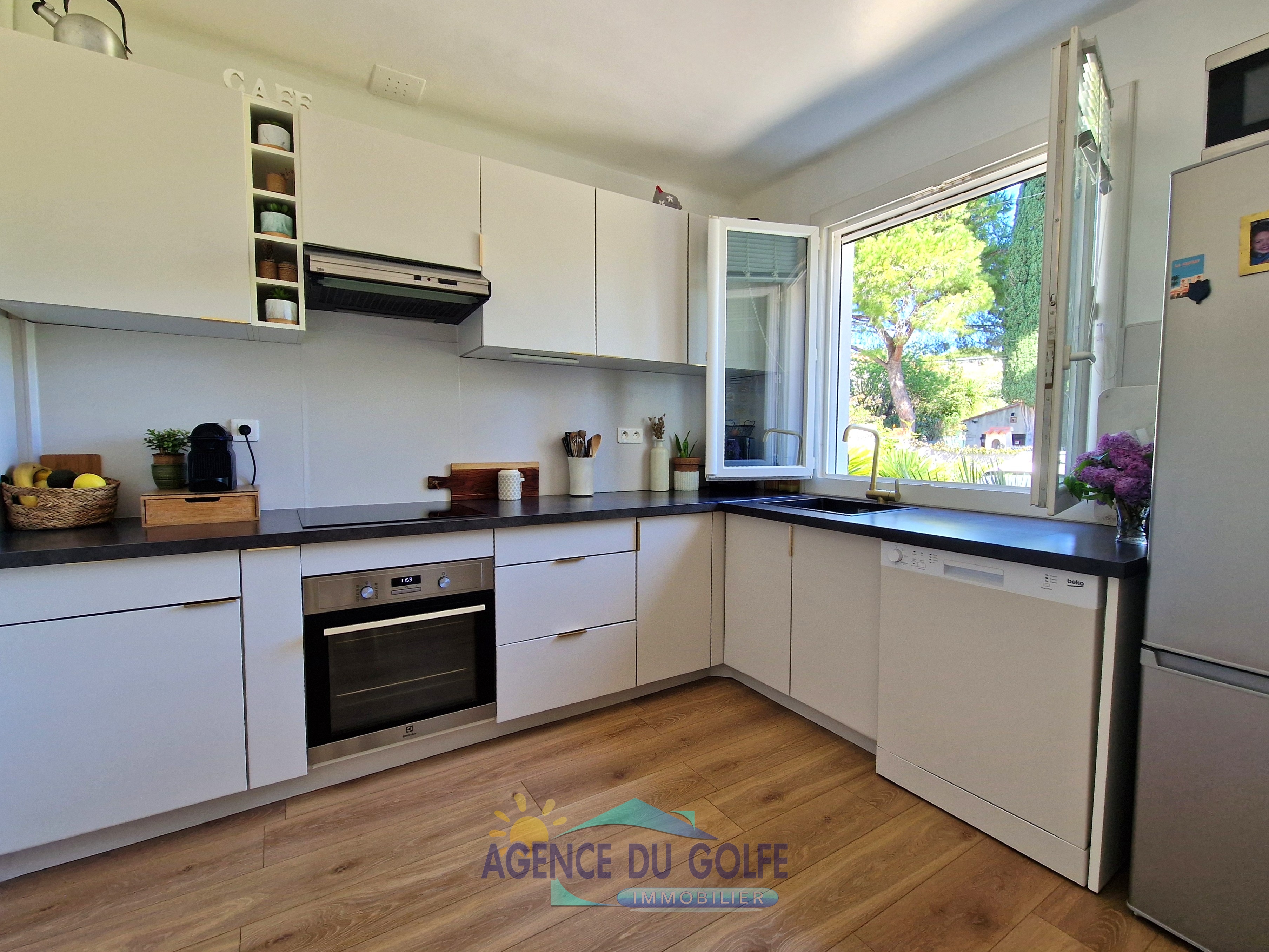 La cuisine, moderne et parfaitement équipée, s'intègre avec élégance à l'ensemble.